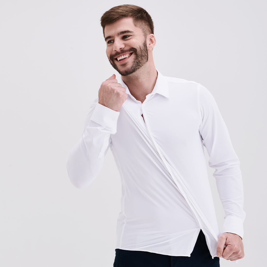 Feita com tecido tecnológico de poliamida e elastano, nossa Camisa é 10x mais elástica do que uma Camisa comum.